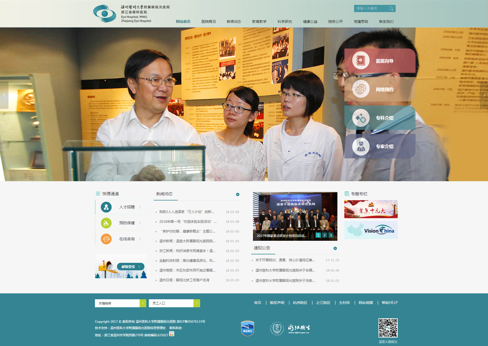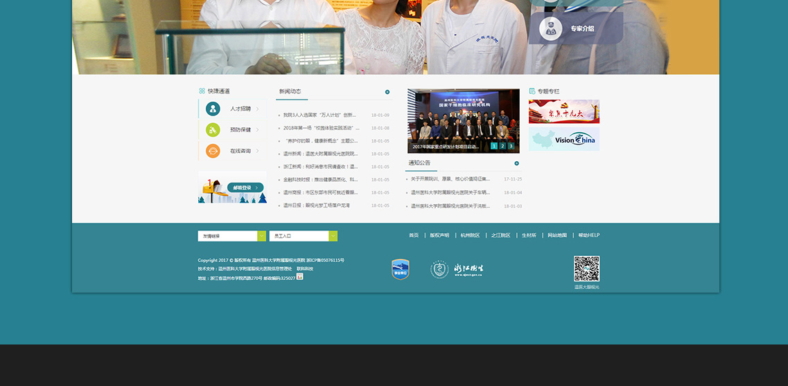 溫州醫(yī)科大學(xué)附屬眼視光醫(yī)院成立于1998年,2009年經(jīng)省衛(wèi)生廳批準增掛“浙江省眼科醫(yī)院”,設(shè)有溫州總院、杭州院區(qū)、之江院區(qū)等三個院區(qū),是目前浙江省唯一一家三級甲等眼科??漆t(yī)院。經(jīng)過近二十年的發(fā)展,醫(yī)院形成了集醫(yī)療、教學(xué)、科研、產(chǎn)業(yè)、公益、推廣為一體的眼視光體系。 【醫(yī)療服務(wù)】醫(yī)院是國家臨床重點??平ㄔO(shè)單位。2016年醫(yī)院門診量近70萬人次,開展手術(shù)4.85萬例,病人來自全國各地,其中溫州市外就診人次占比達到60.7%。醫(yī)院??讫R全,目前共設(shè)19個