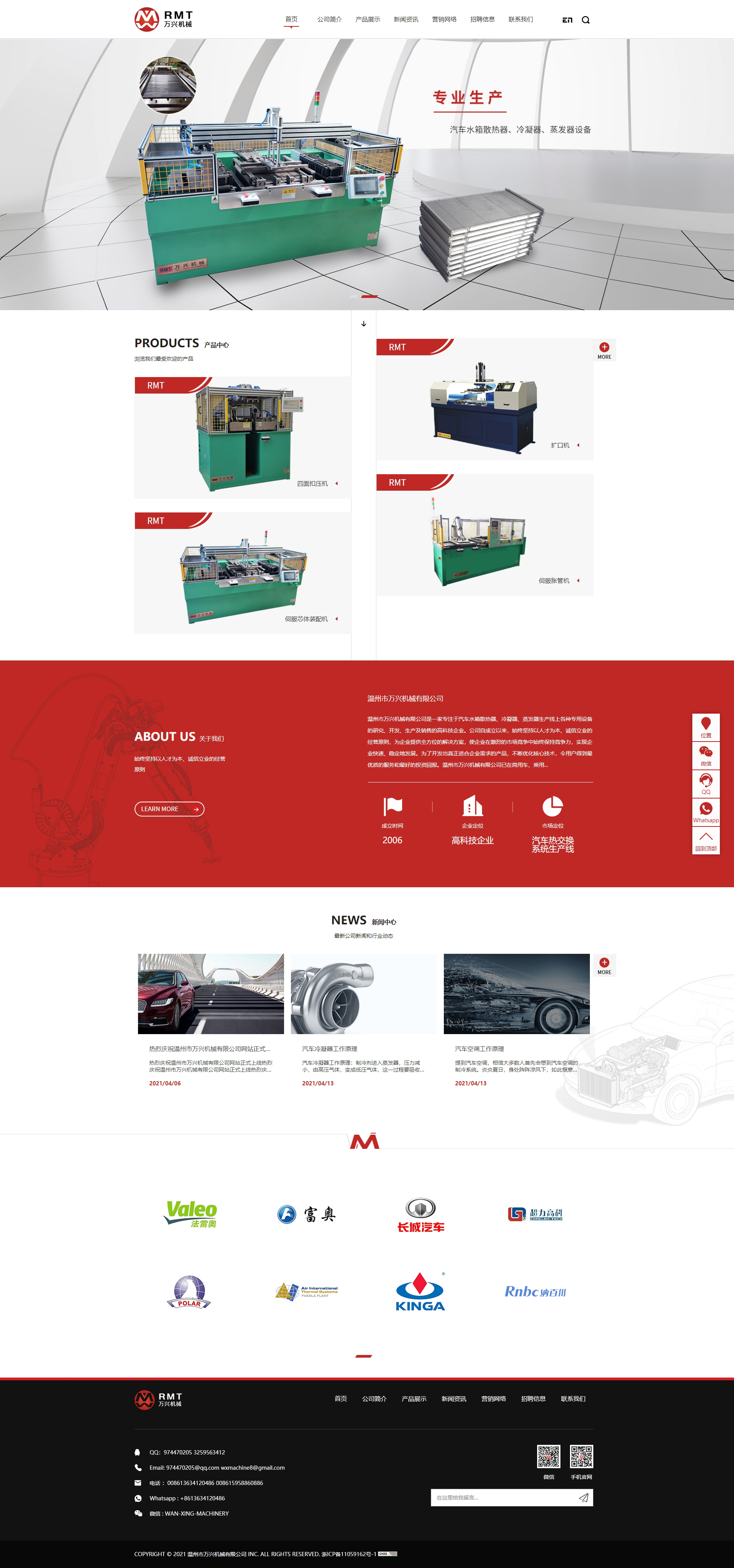 溫州市萬興機械有限公司是一家專注于汽車水箱散熱器、冷凝器、蒸發(fā)器生產(chǎn)線上各種專用設(shè)備的研究、開發(fā)、生產(chǎn)及銷售的高科技企業(yè)。公司自成立以來,始終堅持以人才為本、誠信立業(yè)的經(jīng)營原則,為企業(yè)提供全方位的解決方案,使企業(yè)在激烈的市場競爭中始終保持競爭力,實現(xiàn)企業(yè)快速、穩(wěn)定地發(fā)展。為了開發(fā)出真正適合企業(yè)需求的產(chǎn)品,不斷優(yōu)化核心技術(shù),令用戶得到優(yōu)質(zhì)的服務(wù)和好的投資回報。