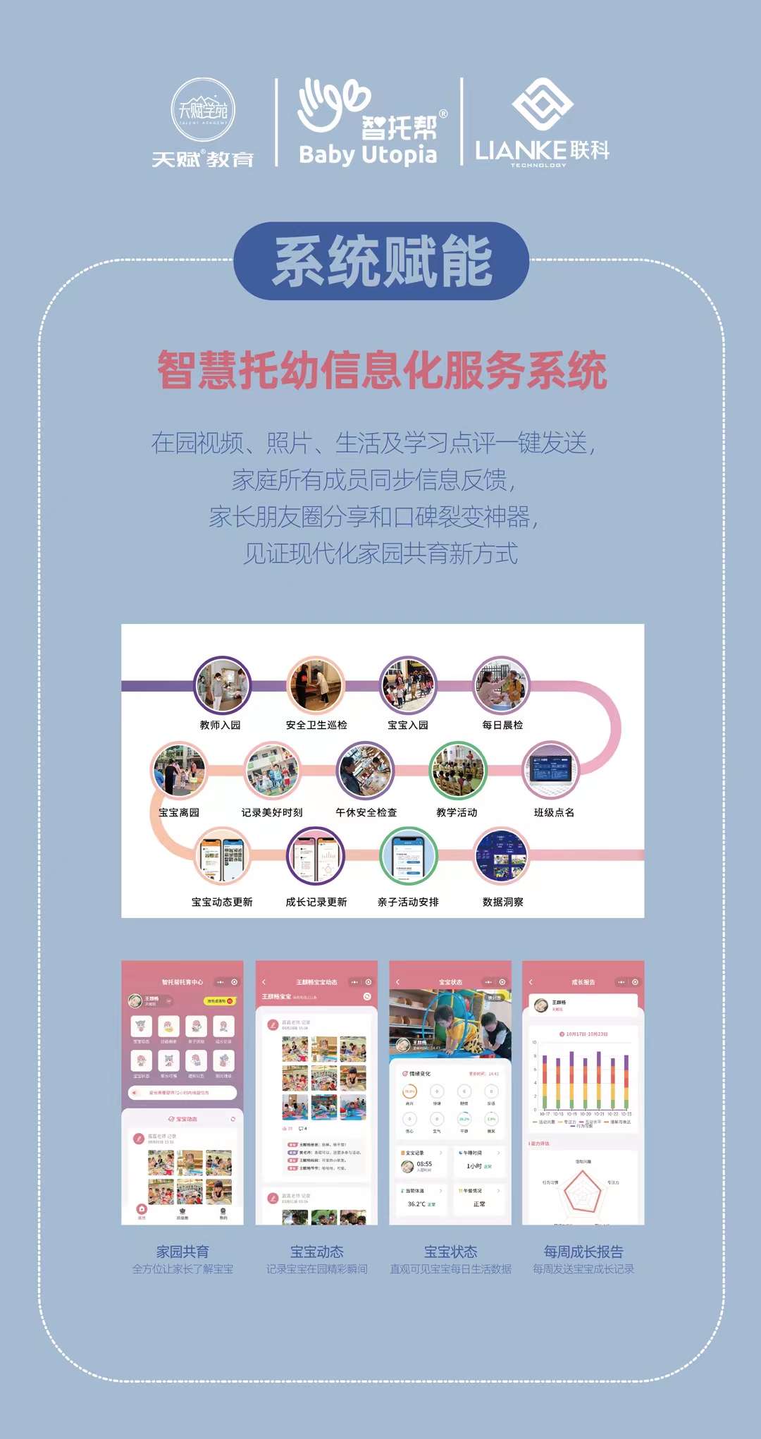 本次展會(huì)我們帶來(lái)許多實(shí)物產(chǎn)品之外,最重要的是推出了《聯(lián)科智慧托幼系統(tǒng)