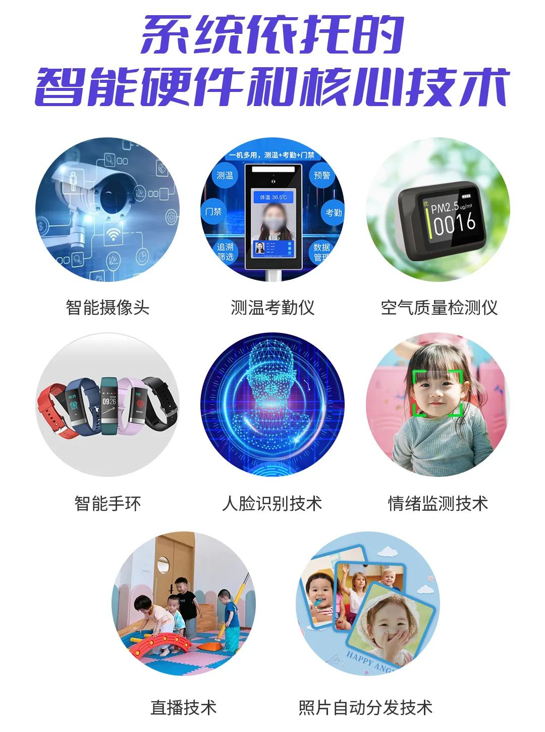 本系統(tǒng)充分利用互聯(lián)網(wǎng)、大數(shù)據(jù)、物聯(lián)網(wǎng)、人工智能、智能硬件等技術(shù),將智能硬件設(shè)備與多元化軟件模塊深度結(jié)合,既為托育園、幼兒園各項(xiàng)管理工作提供便捷的工具輔助,又實(shí)現(xiàn)了數(shù)據(jù)的伴隨式采集和實(shí)時(shí)應(yīng)用。系統(tǒng)結(jié)合嬰幼兒照護(hù)服務(wù)實(shí)際,提升園所保教服務(wù)質(zhì)量和安全保障,基于園所數(shù)字化運(yùn)營(yíng)需要,實(shí)現(xiàn)園務(wù)管理、家園共育、教學(xué)管理、營(yíng)銷招生、智慧監(jiān)管、衛(wèi)生保健、臺(tái)賬管理等功能。