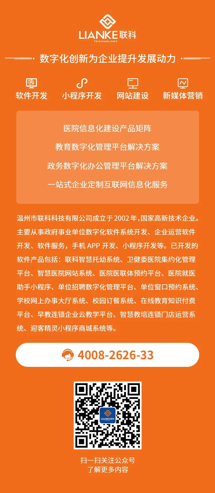 聯(lián)科自成立以來已有多年歷程,在服務(wù)醫(yī)療體系,構(gòu)建互聯(lián)網(wǎng)醫(yī)院的過程中我們積累了豐富的行業(yè)經(jīng)驗(yàn)和專業(yè)知識(shí)。我們以大氣的海報(bào)設(shè)計(jì)、便捷的服務(wù)體驗(yàn)、實(shí)力雄厚的專家科室、全面的新聞資訊以及創(chuàng)新的特色診療為核心競(jìng)爭(zhēng)力,致力于為用戶提供高品質(zhì)、全方位的服務(wù)。我們將繼續(xù)秉承“大氣、便民、專業(yè)、創(chuàng)新”的理念,不斷提升醫(yī)院的綜合實(shí)力和服務(wù)水平,為廣大患者提供更加優(yōu)質(zhì)、高效的醫(yī)療服務(wù)。