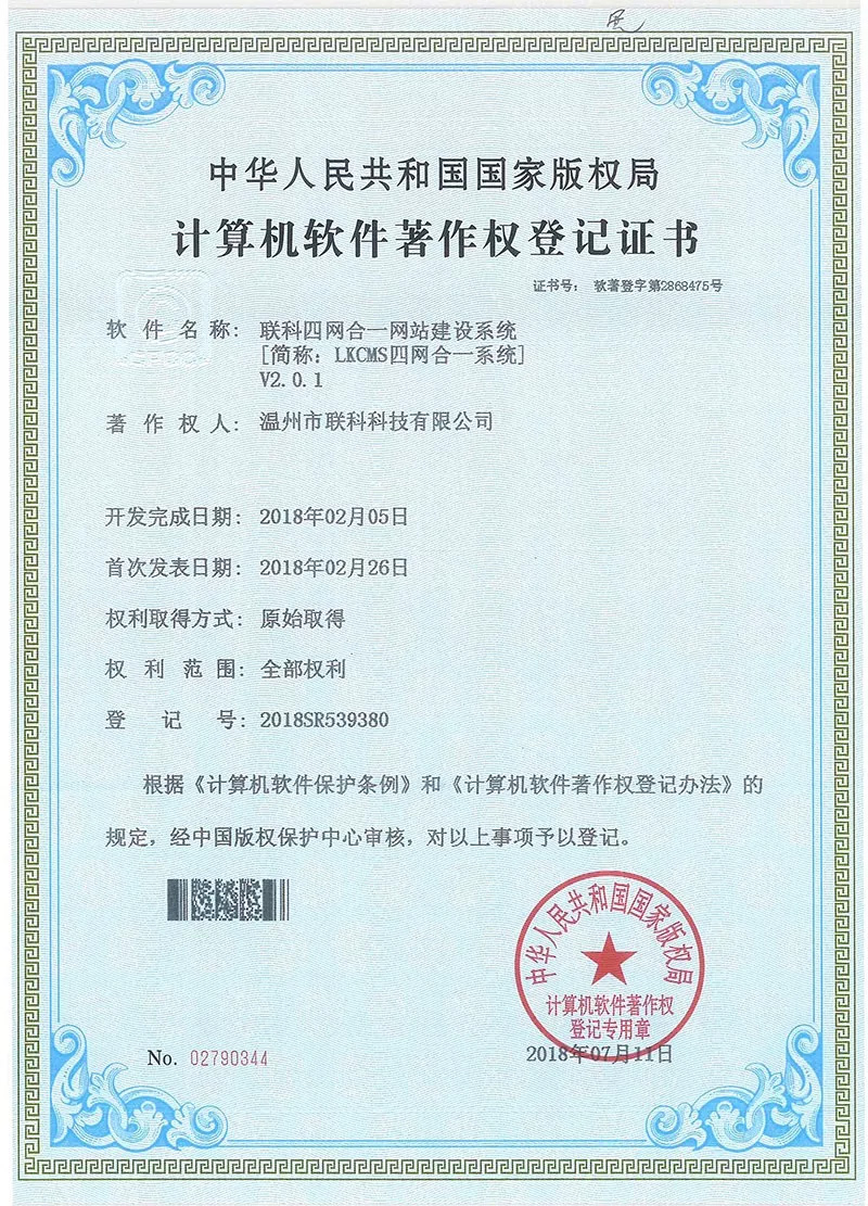 《聯(lián)科四網(wǎng)合一網(wǎng)站建設(shè)系統(tǒng)V2.0.1》于2018年07月11日被正式授予《中華人民共和國(guó)國(guó)家版權(quán)局計(jì)算機(jī)軟件著作權(quán)登記證書(shū)》,登記號(hào)為2018SR539380。