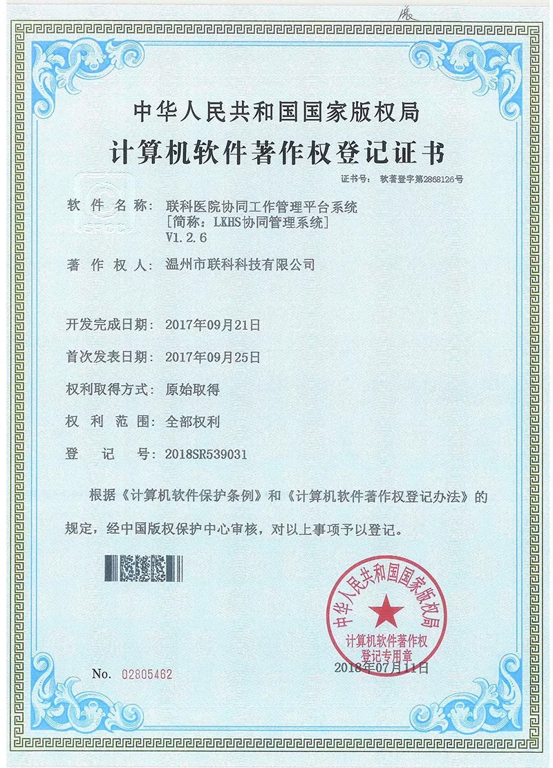 《聯(lián)科醫(yī)院協(xié)同工作管理平臺(tái)系統(tǒng)V1.2.6》于2018年07月11日被正式授予《中華人民共和國(guó)國(guó)家版權(quán)局計(jì)算機(jī)軟件著作權(quán)登記證書(shū)》,登記號(hào)為2018SR539031。