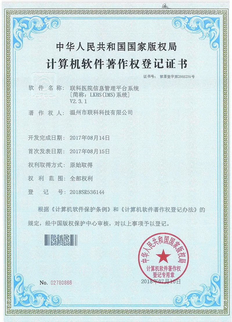 《聯(lián)科醫(yī)院信息管理平臺(tái)系統(tǒng)V2.3.1》于2018年07月10日被正式授予《中華人民共和國(guó)國(guó)家版權(quán)局計(jì)算機(jī)軟件著作權(quán)登記證書(shū)》,登記號(hào)為2018SR536144。