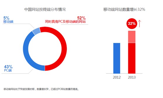 在這份報告中,我們不難看出PC與移動的同步發(fā)展是未來的一大趨勢,就拿2012年與2013年的移動端網(wǎng)站的情況對比,2013年的移動端網(wǎng)站數(shù)量增加了32%,而這一數(shù)據(jù)還保持著快速增長的發(fā)展趨勢。