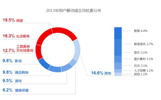 在百度站長平臺發(fā)布的《2014年中國網(wǎng)站運營發(fā)展趨勢報告》中我們得到這樣一組數(shù)據(jù),用戶主動檢索的分布主要是集中在生活服務(wù)、商品購物、健康保健、影視視頻相關(guān)、教育相關(guān)、音樂相關(guān)、小說、基于地理位置的信息服務(wù)(LBS)、游戲這幾個方面,可以看出用戶在這些方面的需求非常旺盛的。