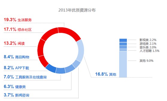 雖然,移動端網(wǎng)站、移動端服務(wù)沒有完善的服務(wù)體系,尚處于發(fā)展的上坡路之中,仍舊有一些企業(yè)能夠做出一些優(yōu)質(zhì)的移動端資源,而這些優(yōu)質(zhì)資源主要是集中在生活服務(wù)類、綜合社區(qū)類、閱讀、商品購物、APP下載,不僅占比最高而且增速明顯,如圖中的數(shù)據(jù)顯示可以看出。