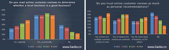 圖1:88%的人閱讀評論來確定本地業(yè)務(wù)的質(zhì)量(左)&88%的消費者表示相信在線評論的個人推薦(右)