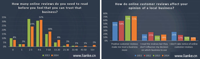 圖2:85%的消費者表示,他們閱讀10+(左)&72%的消費者表示正面評價使他們信任加深(右)