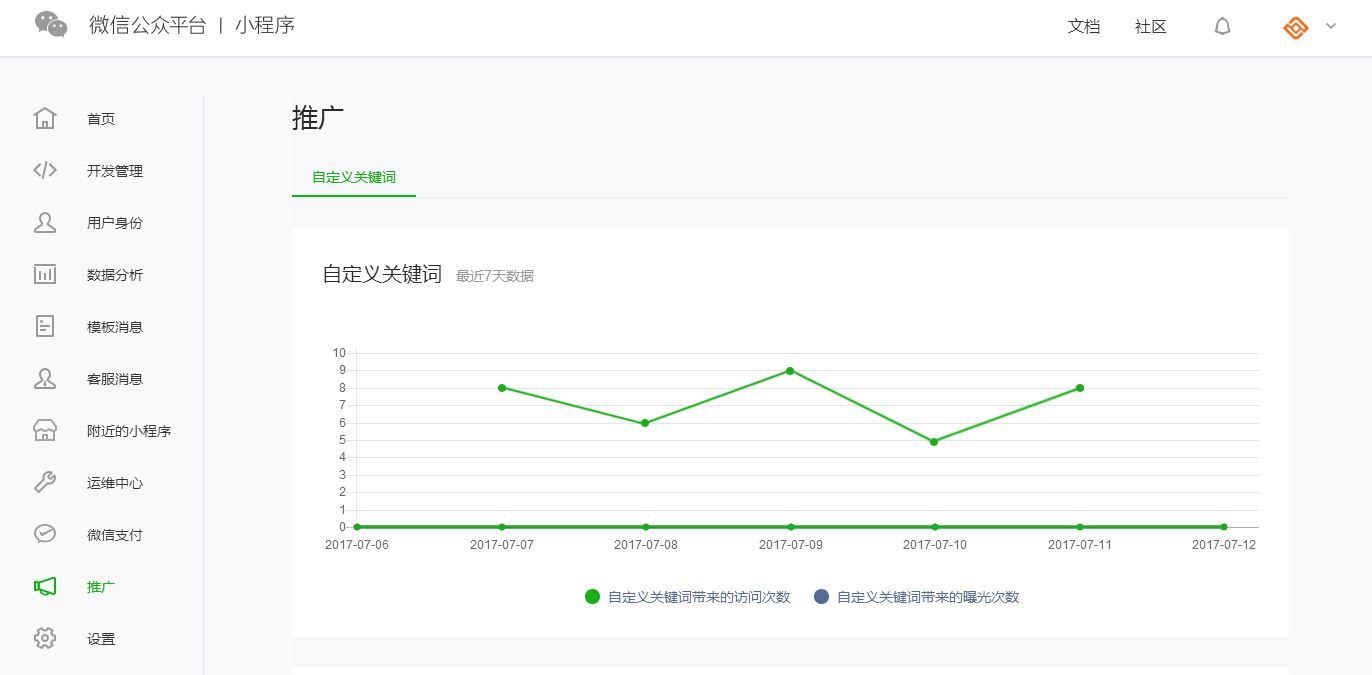 可在小程序后臺的 “推廣” 模塊中,查看通過自定義關(guān)鍵詞帶來的訪問次數(shù)。