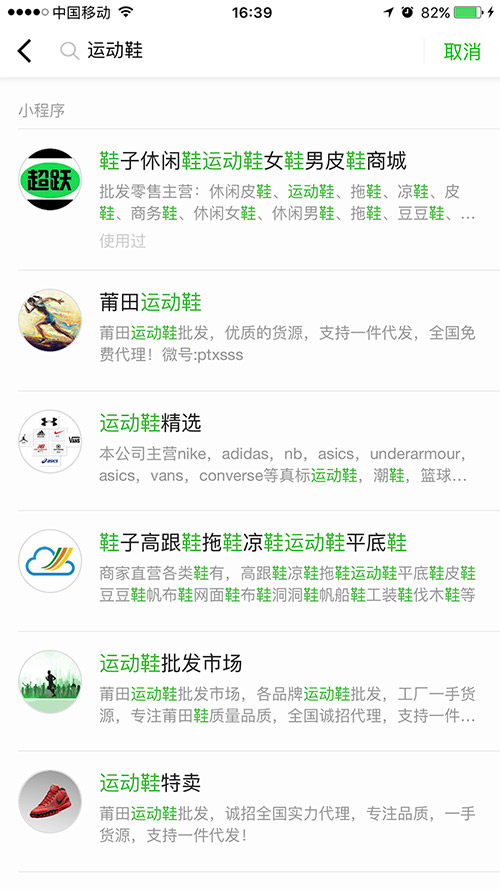 比如上面的圖片中,小程序中搜索關(guān)鍵詞“運動鞋”,就出現(xiàn)很多相關(guān)的關(guān)鍵詞,如男鞋、女鞋、涼鞋、皮鞋、商務(wù)鞋等這些用戶使用頻率高的產(chǎn)品關(guān)鍵詞,當(dāng)用戶去搜索男鞋、女鞋這些詞的時候這個小程序依然會有展現(xiàn)的概率。
